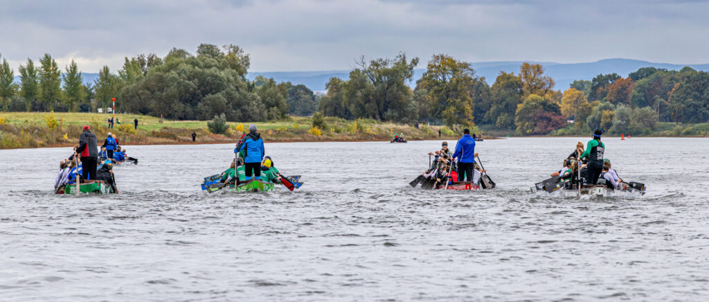 Um halbwegs zu bestehen, trainierte unser Team drei Mal jeweils Mittwoch eine Stunde lang auf dem Mondsee. Die Zeiten verbesserten sich von Trainingseinheit zu Trainingseinheit. Aus dem vorliegenden Regattaablauf wussten wir, dass dieses Rennen eine ganz große Herausforderung werden würde, zumal wir auch keine Erfahrung auf Fließgewässern besaßen. Entsprechend der Ausschreibung mussten auf der Elbe stromaufwärts drei Bojen jeweils einmal und eine Boje stromabwärts zweimal umfahren werden.
