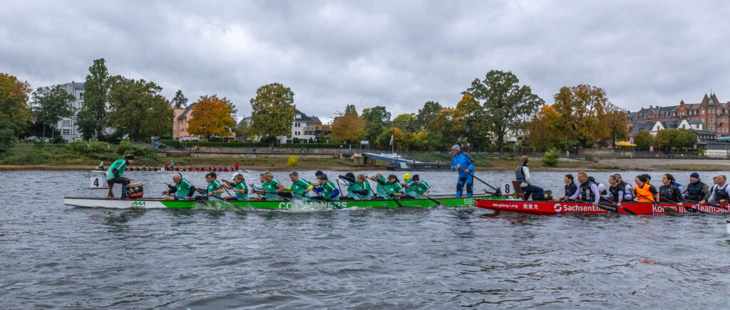 Der Veranstalter hatte alles sehr gut vorbereitet, obwohl sich der Regattaablauf nicht einfach las. Am Ende klappte alles wie am Schnürchen, das Wässern unseres „SIEGfrieds“, das Anlegen am Steg, der Start im 30-Sekunden-Abstand (wir starteten als viertes Boot von acht) und das eigentliche Rennen. Speziell das Hochfahren zur letzten Boje stromaufwärts hatte es in sich. Drei Boote waren über 1.000 Meter gleichauf und wir mittendrin. Rechts davon fuhr ein Schaufelraddampfer. Für die zahlreich auf Deck anwesenden Passagiere war das natürlich ein richtiges Spektakel. An der letzten Wende stromaufwärts wurden wir von einem überholten Boot am Heck getroffen und verloren dadurch etliche Meter. Im Endspurt kamen wir nochmal an das vor uns gestartet Team heran und waren uns sicher, nicht Letzter zu sein.